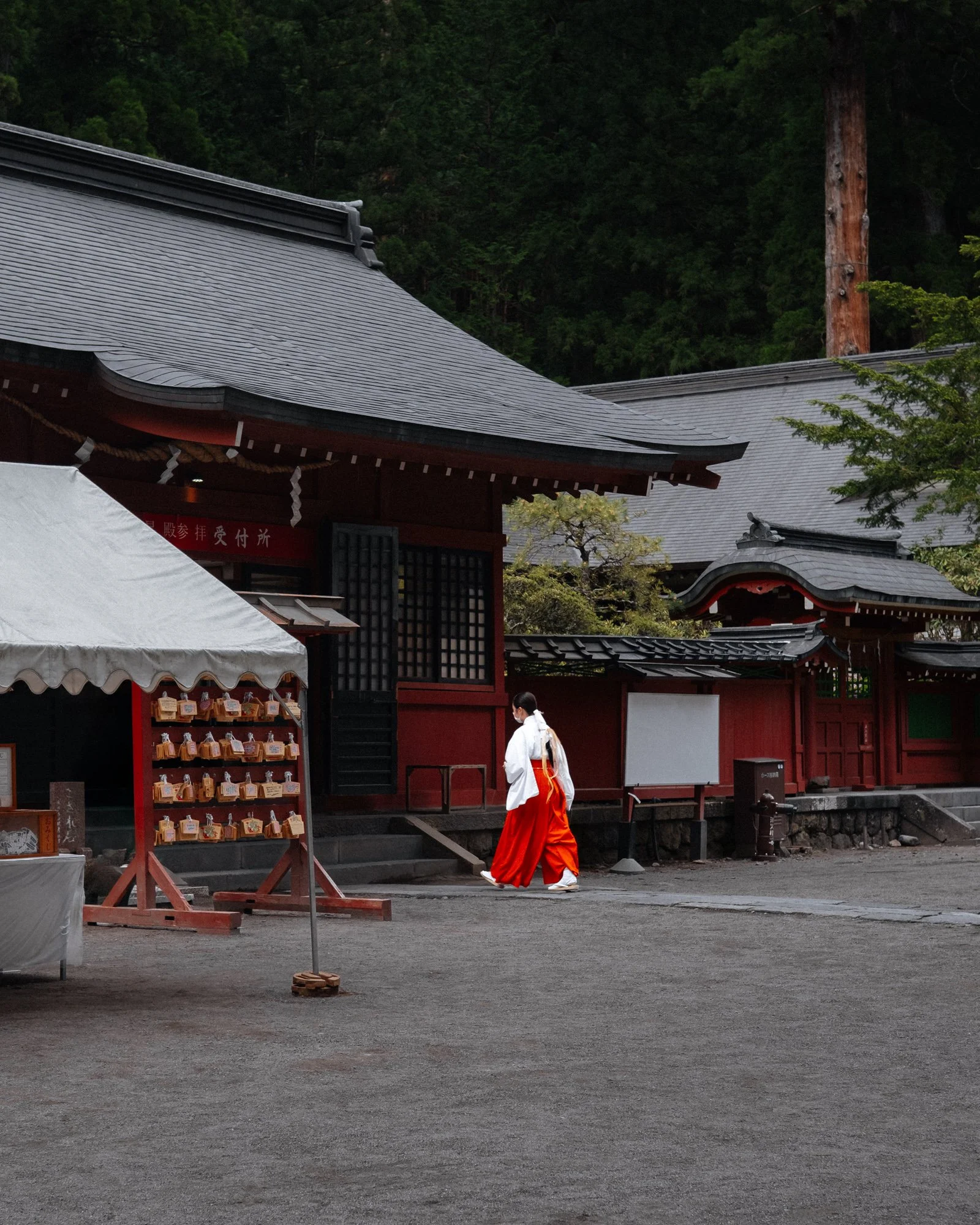 Walking through the forest, a girl in traditional clothing approaches a red temple, caught between the serenity of the trees and the weight of the sacred space.