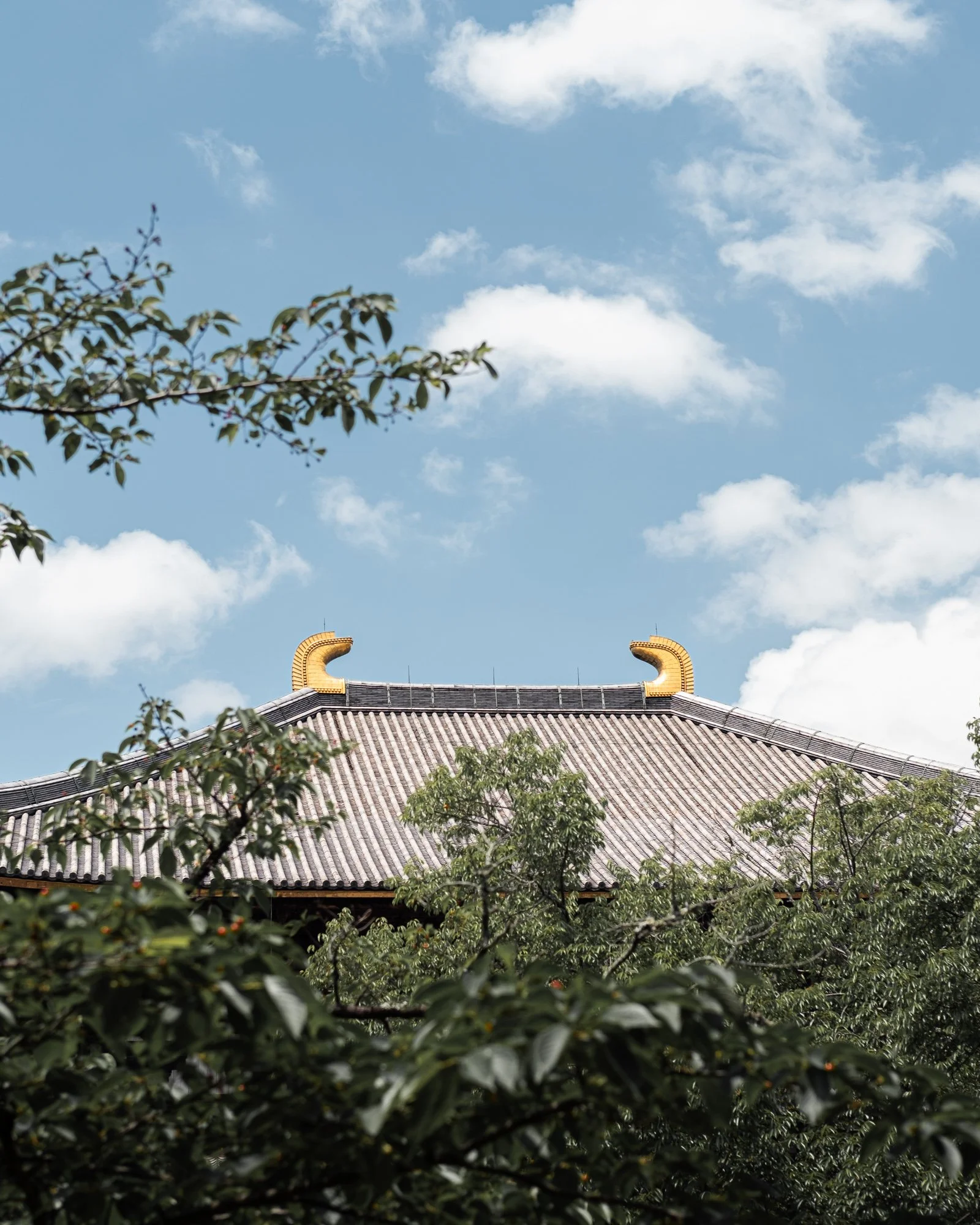 A quiet temple reveals itself among the the green, with the sky above painted in soft blues and clouds.