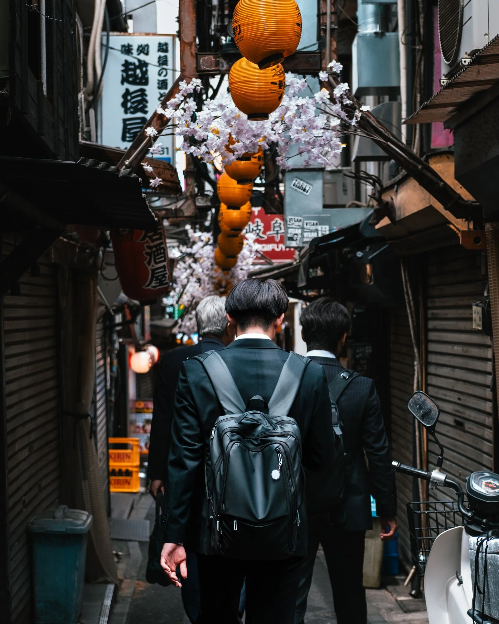 A man in work clothes walks through Shinjuku alley, illuminated by lanterns and cherry blossom.