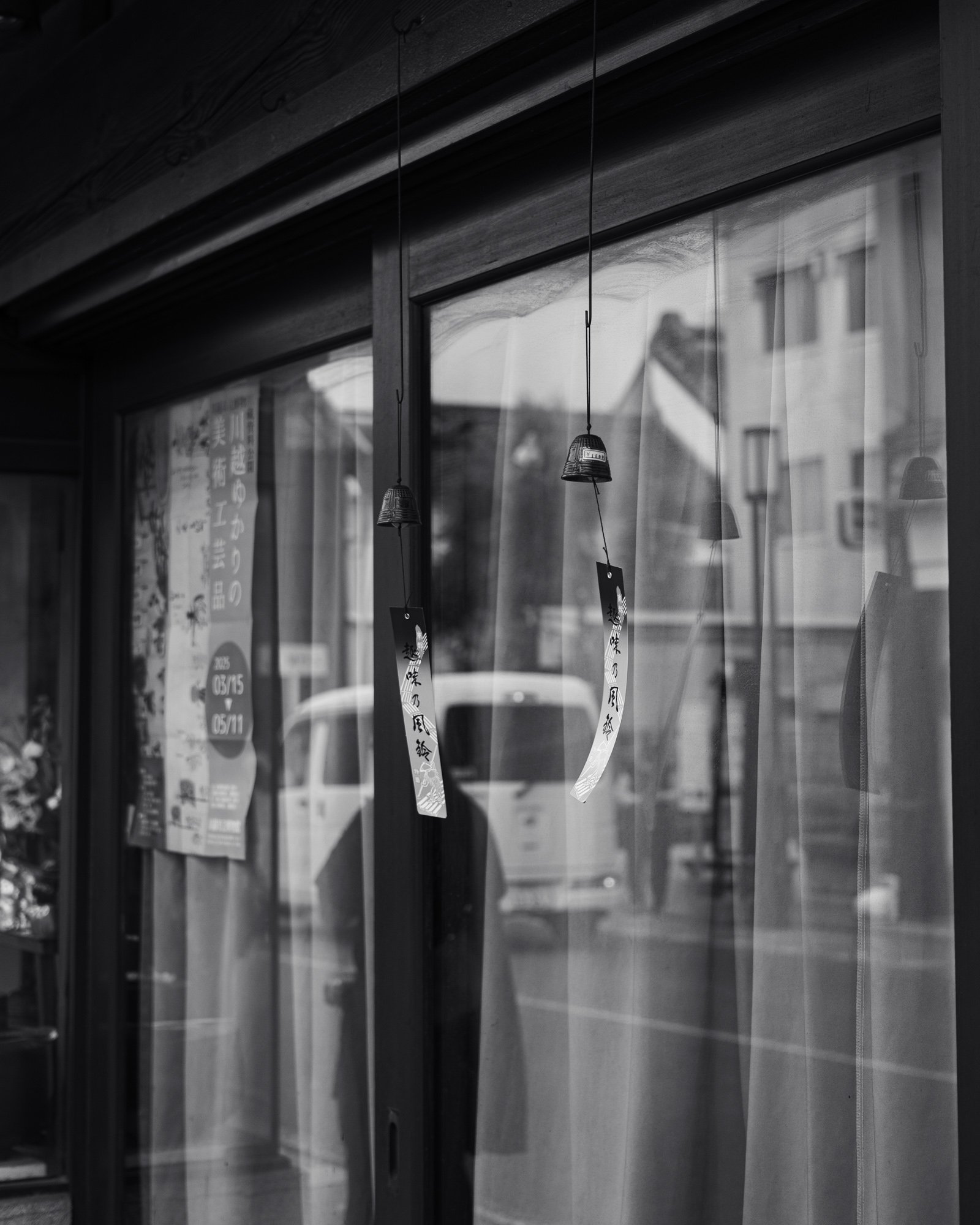 Two tiny bells with paper tags, hang outside a home, quietly marking a fleeting moment in monochrome.